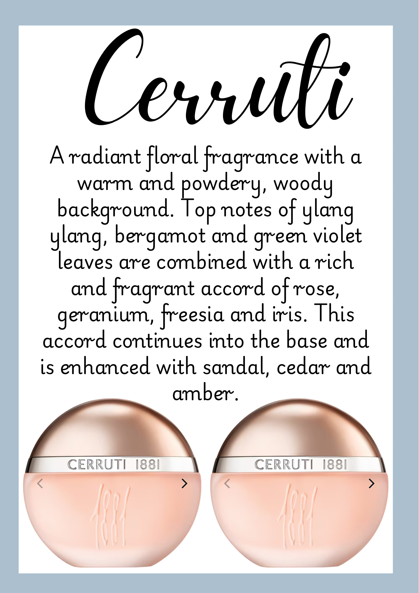 A radiant floral fragrance with a warm and powdery, woody background. Top notes of ylang ylang, bergamot and green violet leaves are combined with a rich and fragrant accord of rose, geranium, freesia and iris. This accord continues into the base and is enhanced with sandal, cedar and amber
