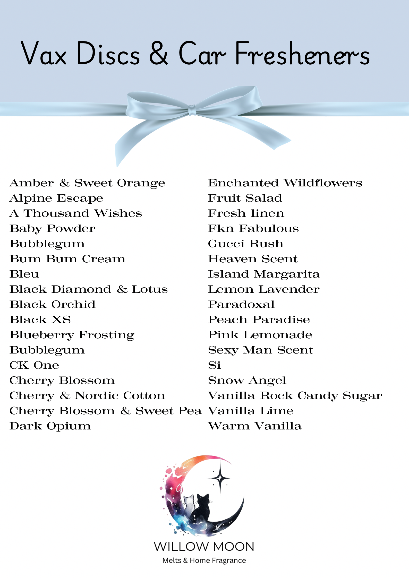 Set of 6 mini vaxx discs. Can be made in any of the scents on the second picture. Choose your scent in the checkout form